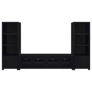 Transform your living room into the ultimate entertainment hub with this sophisticated three-piece entertainment center. Anchored by a commanding 79-inch TV stand, this set is designed to accommodate up to an 85-inch television, bringing a cinematic experience right into your home. The TV stand features four doors that open to adjustable shelves, perfect for organizing your media devices, gaming consoles, and more. Flanking the TV stand, two sleek media towers offer additional storage and display options, with open shelving for your favorite books and decor, and a concealed cabinet for hidden storage. Finished in a striking black hue, this entertainment center blends modern elegance with functional design, creating a seamless and stylish focal point in your living space.