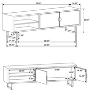 A dramatic charcoal black finish coats wood products construction, adding a bold look to this casual yet elegant TV stand. Gather entertainment-related gear and organize it in this tasteful stand built of mango wood with a rustic aesthetic. Set atop black finish iron bracket legs, it creates a sturdy venue for a large flat-screen TV. Components find room in two side compartments, as incidentals and media may be stashed on a fixed shelf behind two side doors with ornate iron hardware. Avoid clutter with a pre-cut wire management hole. Key Features: • Elevate your entertainment area with a TV stand featuring a dramatic charcoal black finish, infusing a bold and elegant touch • Crafted from wood products with a mango wood rustic aesthetic, this stand offers a tasteful solution for organizing your entertainment-related gear • Sturdy iron bracket legs in a matching black finish provide a stable base for your large flat-screen TV • Keep your components organized in two side compartments, while incidentals and media items can be stored behind two side doors adorned with ornate iron hardware • Say goodbye to cable clutter with a convenient pre-cut wire management hole, maintaining a clean and tidy look in your living space