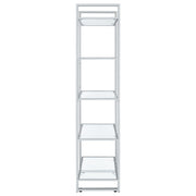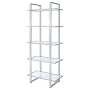 Create a well styled living space that radiates modern luxury. This contemporary bookcase delivers sleek lines of metal in your choice of gorgeous, polished finishes. The shelves are made with tempered glass for smooth, sturdy support. With five shelves total, it offers ample space to display photos, keepsakes, and more. Perfect for a living room, home office, or den, this fresh, modern bookcase is a fabulous choice for any home. Key Features: • Contemporary glass bookcase with five clear tempered glass shelves • Polished chrome frame creates a reflective and open visual effect • Electroplated metal structure enhances durability and shine • Tempered glass shelves offer strong support for books or display • Sleek vertical profile fits modern offices, dens, or studios • Includes tip-over restraint for secure placement in any room