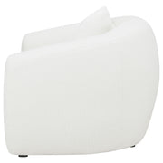 Elevate your modern living room with this cheerful, contemporary natural lounge chair, upholstered in a white teddy boucle fabric across its elegantly curved silhouette and sloped armrests. A single accent pillow in a matching boucle rests against the bench cushion and tailored backrest as discreet bold black legs offer a slight elevation.