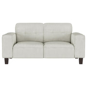 Infuse tailored elegance with the tufted details of a modern sofa set. Featuring a three-seat sofa and two-seat loveseat, this set offers a refined anchor for your living room seating. Smooth, soft upholstery adds neutral color, while plush foam and sinuous springs ensure optimal comfort. The sofa and loveseat each feature tufted back cushions, offering a refined touch of mid-century charm. Track arms define a straight, clean-lined silhouette that's simply timeless and each piece stands on dark brown finished tapered wooden legs that add airy height. Key Features: • Hints of mid-century character infuse charm into a two-piece modern sofa set • Plush back cushions are tufted to create a sense of depth and dimension in your living room • Inviting upholstery and plush foam cushions create incredible comfort for lounging or entertaining • Timeless silhouette features tapering dark brown finished wooden legs and wide, straight track arms • Sinuous spring decking supports seats and back for incredible comfort and support that lasts