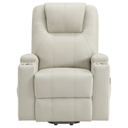 This power lift recliner delivers premium comfort and functionality, perfect for relaxing in style. The chair features luxurious faux leather upholstery and an ergonomic design to support your body at every angle. The power lift mechanism ensures easy movement in and out of the chair, offering assistance for standing or sitting with minimal effort. With integrated cup holders and side storage pockets, convenience is at your fingertips. The chair also includes massage and heat functions, allowing you to unwind and soothe your muscles after a long day. The wired remote control provides effortless operation of all features, from reclining to massage intensity. Key Features: • Power lift recliner with heat and massage functions offers comfort and support with ergonomic contouring • Faux leather upholstery delivers a sleek look with a smooth, easy-clean surface and soft touch • Integrated lift mechanism assists with sitting or standing for enhanced daily accessibility and ease • Dual cup holders and side storage pockets keep remotes, drinks, or essentials within arm’s reach • Wired remotes control recline, lift, heat, and massage features with intuitive button operation • Built from heavy-gauge metal and engineered wood for lasting structure and supportive durability
