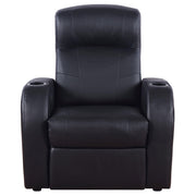Enjoy the perfect blend of sophistication and comfort with this black leather recliner. Upholstered in smooth top grain leather everywhere the body touches, it offers a sleek, modern silhouette with refined stitching details. A high back cushion and low rounded track arms provide ergonomic support, while the pocket coil seating ensures long-lasting comfort. With a wall-hugger mechanism, this recliner saves space while delivering full relaxation, making it an ideal addition to a home theater or living room._x005F_x000D_ Key Features: • Modern recliner upholstered in black top grain leather everywhere the body touches • Wall-hugger mechanism allows full recline while conserving floor space • High backrest and low rounded arms provide ergonomic comfort and support • Supportive pocket coil seating ensures lasting durability and relaxation • Dual cupholders integrated in the armrests for convenient beverage placement • Crafted with acacia, foam, leather, and plywood for strong reliable build