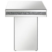 Showcase sculptures and decor on this stunning, modern glam accent table. A square table sits on a tall square pedestal for an edgy, bold expression. Smooth mirror trim and surfaces cover every edge, creating a sleek flair. Glittering acrylic crystals line the interior of a clear center band for an elevated luxurious touch. Small disguised feet offer a subtle elevation over rugs and floors and offer extra stability. Key Features: • Square shape offers bold, edgy flair and eye-catching look • Mirror tile trim encompasses the surface for a highly reflective frame • Acrylic crystal accents tucked within clear center offer a breathtaking glamorous expression • Tall column pedestal base levitates the table surface for a sleek silhouette • Small feet beneath offer subtle lift to keep table stable on rugs and flooring