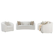 Create your modern entertaining area with this mid-century modern-inspired contemporary seating set, upholstered in a neutral latte finished boucle fabric across its elegant and curvy silhouette. Curved and sloped armrests and plush cushions keep family and visitors comfortable all through the gathering. Coordinating boucle accent pillows with premium faux down fill provide extra comfort as discreet black legs offer a bit of elevation and definition over decorative rugs.