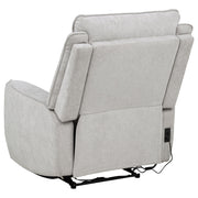 Sink into indulgent comfort with this power recliner, tailored for quiet moments and deep relaxation. Draped in soft dove grey chenille, it features sculpted cushions and gently rounded arms for an inviting silhouette. At the touch of a button, the seat extends smoothly, offering effortless recline. A built-in anti-pinch safety function halts motion when resistance is detected, making it a haven of both comfort and reassurance. Key Features: • Power recliner with sculpted form and plush padding offers cozy, modern comfort • Dove grey chenille upholstery adds softness with a clean monochrome finish • Push-button recline delivers smooth motion for customizable lounging • Supportive seat and back cushions cradle the body in relaxed alignment • Anti-pinch mechanism stops recline when resistance is detected for safety • Wrapped in soft chenille over foam with a durable wood and metal frame