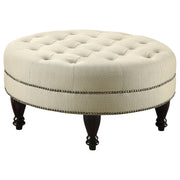 An ottoman is normally an ideal place to prop up your feet when relaxing in a comfortable recliner. At nearly three feet in diameter, however, this ottoman is more likely to accommodate both a sleeping child and dog. Upholstered in oatmeal color linen-like fabric, it feels as comfortable as it looks. Styled with two rows of bronze nailhead trim and a tufted seat, it has aesthetics to match. Completing the look are turned legs in dark brown. Key Features: • Upscale design reminiscent of a swanky late-night lounge • Round ottoman upholstered in an oatmeal colored linen-like fabric • Features two rows of bronze nailhead trim • Trendy tufted seat • Turned legs in rich dark brown