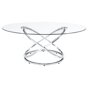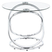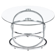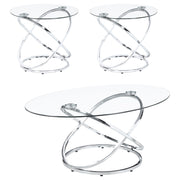 This striking coffee table set includes a cocktail table and two matching side tables, perfect for modern living spaces. Featuring clear tempered glass tops, these tables exude elegance and durability. The bases showcase polished chrome-finished metal in an intertwined ring design, adding a touch of contemporary flair. The open framework enhances visual lightness, making the set ideal for smaller spaces. Designed for style and functionality, this set is a versatile addition to any room. Key Features: • Modern coffee table set includes a cocktail table and two stylish matching side tables • Clear tempered glass tops combine elegance with enhanced strength and lasting durability • Intricate intertwined ring bases create an open and visually airy modern design • Polished electroplated chrome finish adds a sleek and sophisticated appeal • Heavy gauge metal construction ensures stability and reliable everyday use • Versatile design enhances style and functionality for contemporary living spaces
