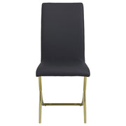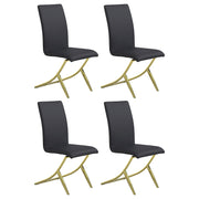 Elevate your dining space with this sophisticated side chair, featuring a sculptural brass metal base and smooth white leatherette upholstery. The armless silhouette and curved back offer modern flair with ergonomic comfort, while the crisscross leg design adds an artistic touch. Ideal for contemporary dining rooms, this chair pairs beautifully with glass or high-gloss tables for a chic, upscale look. Key Features: • Sleek, armless side chair with a modern high-back silhouette • Finished in lustrous brass for a bold, contemporary statement • Sculptural crisscross base brings dynamic style to your dining setup • Smooth leatherette seat and back offer cushioned comfort and easy care • Crafted from durable engineered wood, plush foam, and heavy-gauge metal • Ideal for modern dining rooms seeking a clean, polished aesthetic