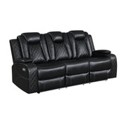 The Orion Motion Collection is a comfortable and stylish choice for any home. The collection includes a sofa with dual recliners, a console loveseat with dual recliners, and a glider recliner, providing you with plenty of options for relaxation.Made from a combination of 80% polyester and 20% faux leather, the Orion Motion Collection is upholstered in either black or white, giving you a choice to match your decor. The collection storage arms, a drop down center sofa back drink tray with a lift up light bar, and a wireless charger, making it convenient and practical for any space.In addition, the Orion Motion Collection includes theater lighting on the sofa and loveseat, as well as a Bluetooth speaker on the loveseat. The collection is also equipped with coil cushions and a hardwood/plywood frame, ensuring comfort and durability. The knockdown wing feature makes it easy to transport and assemble.Overall, the Orion Motion Collection is a stylish and comfortable choice for any home. Its convenient and durable construction make it a great addition to any living space.