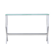Add modern sophistication to your home with this sleek rectangular console table. Featuring a clear tempered glass top and a matching lower shelf, it offers ample space for storage or display. The elegant curved legs and open design enhance its airy, contemporary feel, while the electroplated polished chrome frame ensures durability and style. Perfect for hallways, entryways, or behind a sofa, this console table blends functionality with a striking modern aesthetic.