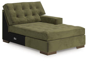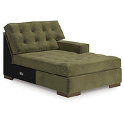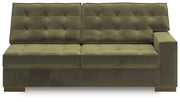 This sleek sectional with chaise offers a highly contemporary look with plenty of space to spread out. Dramatic tufted detailing and luxurious upholstery in a rich olive color create a sophisticated atmosphere. This sectional is perfect for those who love to entertain, or simply relax, in uptown style and comfort.