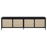 Elevate your entertainment area with this sleek 70-inch TV stand, perfect for accommodating up to a 75-inch TV. The modern design features two door cabinets with stylish radio weave polyethylene (PE) rattan fronts, adding a touch of natural texture to your space. Constructed with a durable metal frame and finished with a sleek powder coating, this stand offers both form and function. Two open-back shelves provide convenient space for devices, ensuring easy cable management and accessibility. With its contemporary appeal and thoughtful design, this TV stand enhances both the style and functionality of your living room. Key Features: • 70-inch TV stand accommodates up to a 75-inch television • Two door cabinets with radio weave PE rattan fronts for added texture • Metal frame construction with a black powder-coated finish for durability • Two tiers of open-back shelving provide easy access to devices • Designed to enhance both the style and functionality of your entertainment space
