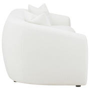 Create your inviting living room with this contemporary natural sofa, upholstered in boucle upholstery throughout its gracefully designed, contoured silhouette and elegantly sloped armrests. Matching accent pillows with premium faux down fill offer extra coziness and comfort to the curved bench cushion and tailored backrest.