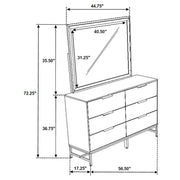 Enjoy the bright white finish featured on this modern dresser and mirror set. Complete with six drawers for easy storage, the dresser includes a framed mirror on top, perfect for getting ready in the morning and adding brightness to your bedroom. The dresser features a white melamine finish, offering excellent durability and resistance to minor scratches and other damage. It's complete with black finish hardware that includes bar pulls for each drawer and a decorative base that provides airy lift in your inviting space. Add photos or a jewelry box for a personal touch. Key Features: • Modern minimalism infuses a stylish six-drawer dresser for clothing and accessory storage • Features a melamine finish in bright, crisp white, offering excellent durability • Versatile color palette is complemented with black finish bar pulls and a decorative base • Six evenly sized drawers create abundant space for clothing, accessories, and even linens • Mirror is fully framed in matching white and features flat, non-beveled glass • Includes a tip-over restraint for added safety and peace of mind