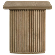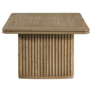 This sculptural coffee table set blends architectural rhythm with natural warmth through its curved pedestal bases and reeded detailing. The rectangular coffee table and square end table feature rounded corners and rich wood grain texture, finished in a distressed light brown tone that enhances their organic appeal. Crafted from engineered wood and ash veneer, this set brings lasting structure and visual harmony to both contemporary and transitional living spaces. Key Features: • Rectangular coffee table and square end table with softened, rounded corners • Distressed light brown finish emphasizes organic grain and tonal depth • Reeded curved pedestal bases add vertical rhythm and sculptural interest • Coffee table provides ample surface for decor, trays, or everyday items • End table adds compact function beside sofas, chairs, or in bedroom use • Engineered wood and ash veneer construction ensures visual and structural longevity