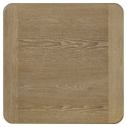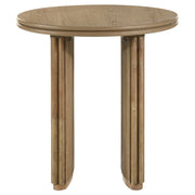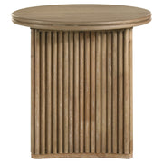 Grounded in architectural simplicity, this square end table showcases sculptural reeding and smooth curvature in a compact, functional form. The softly rounded square top rests over a dual curved pedestal base adorned with vertical reeded detailing, all finished in a warm distressed light brown. Crafted from engineered wood and ash veneer, this side table merges texture, rhythm, and utility as a refined accent for living rooms or bedrooms. Key Features: • Square end table with rounded corners and sculpted dual pedestal base • Distressed light brown finish highlights wood grain and tonal texture • Vertical reeding adds rhythmic detail to the curved panel base • Compact footprint offers surface space beside a sofa, chair, or bed • Crafted from engineered wood and ash veneer for stability and texture • Coordinates with modern and transitional living room or bedroom decor
