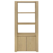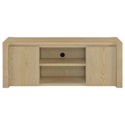 Graceful and grounded, this light oak entertainment center becomes the heart of your living space. A wide TV stand anchors the arrangement with open shelves and hidden storage, flanked by tall media towers that frame the scene with quiet elegance. Adjustable shelving and discreet cord cutouts offer flexibility without distraction. Crafted from engineered wood with a scratch-resistant and eco-friendly laminate veneer, it fits TVs up to sixty-five inches for a beautifully balanced display. Key Features: • Entertainment center with matching towers and TV stand in a warm light oak woodgrain finish • Light oak tone offers organic charm with clean symmetry and modern sophistication • 60-inch TV stand features open shelves and a two-door cabinet with adjustable interior shelf • Each media tower includes three open shelves and cabinet with one adjustable shelf • Rear cord cutouts offer seamless organization and accommodate up to 65 inch TVs • Crafted from engineered wood with a scratch-resistant and eco-friendly laminate veneer