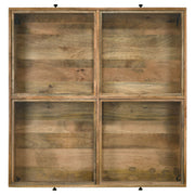 This farmhouse shadowbox coffee table set brings a cohesive charm to your living room. Each piece features a tempered glass top, offering a clear view of memorabilia stored in multiple compartments, accessed by drop-front doors with chain suspension for added character. Crafted from solid mango wood in a warm honey brown finish, the set exudes natural warmth. Sleek iron bases with black finishes provide sturdy support and modern industrial appeal, creating a stylish yet functional living room centerpiece.