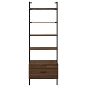 Play up the light, airy ambiance of a modern space while making use of every inch with a modern wall bookcase. It features four floating upper shelves and a lower case with two drawers, perfect for a blend of storage and display in any room. The shelves and two drawers feature a warm walnut finish over melamine paper, offering durability for a lovely look that lasts. A black finish metal frame supports the bookcase, offering neutral appeal in any setting. Stash essentials in the drawers while adding decor to shelves for a personal look and feel. Key Features: • Achieve a minimalist look with the open, airy style of a modern four-shelf wall bookcase • Features four floating shelves and two drawers for a light, refined look in your bedroom or den • Shelves and drawers feature a deep walnut wood finish over melamine paper that's durable and stylish • Metal frame features clean, straight lines and a rich black finish for neutral appeal • Adds storage and maximizes space beside an entertainment center or in a home office
