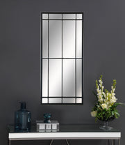 This tall French windowpane mirror features a vertical grid design that adds both elegance and architectural structure. Its elongated form enhances the illusion of ceiling height, while the black metal frame and linear trim offer strong contrast and classic definition. Designed for versatility, it can be hung vertically or horizontally, or used as a wall mirror. Ideal for entryways, bedrooms, or open spaces, it brightens and expands any interior. Key Features: • Tall mirror with a vertical windowpane layout and classic French-inspired design • Black metal frame with linear trim adds clean contrast and architectural styling • Can be hung vertically or horizontally to suit wall proportions and layout • Functions equally well as a leaning full-length wall mirror in open spaces • Elongated shape enhances perceived ceiling height in compact or tall rooms • Ideal for bedrooms, entryways, or living spaces needing a bold focal mirror