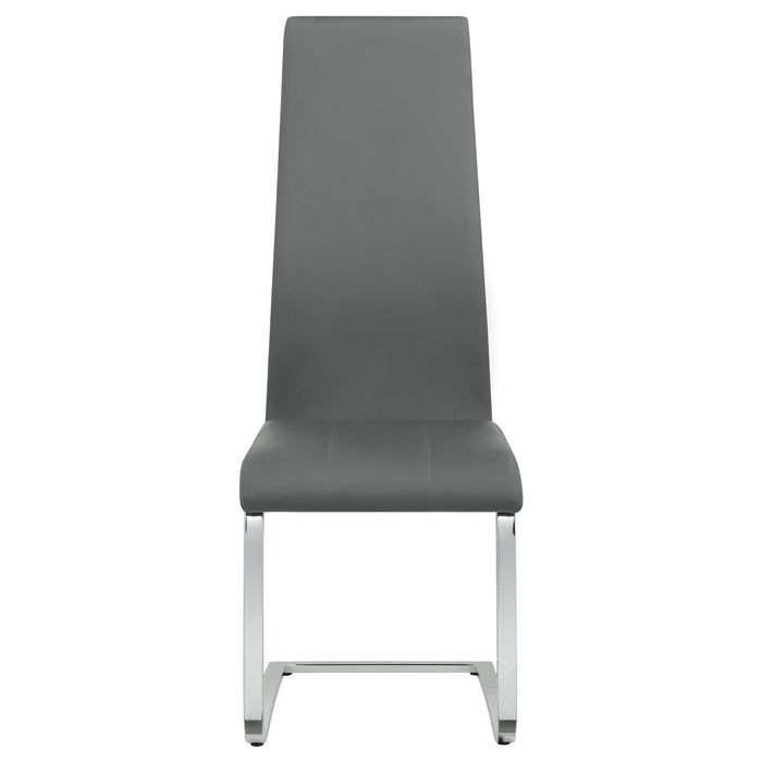 Elevate your dining area with the Anges 5-piece dining set. The contemporary white high gloss finished table features a chrome base for added shine. Complete the ensemble with our iconic Breuer-style chairs, showcasing an ergonomic curved backrest and foam-filled leatherette for ultimate comfort. The U-shaped chrome frame elegantly complements the waterfall edge seat. Available in a range of colors, this set seamlessly merges modern design with unmatched comfort, ensuring every meal is a stylish and comfortable affair. Redefine your dining experience today.