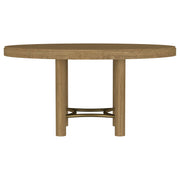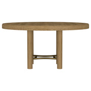 Graceful curves and natural textures define this round dining table, where rustic warmth meets modern refinement. A sand wash wood finish softens the white ash veneer top, while the sculpted base is anchored by cylindrical legs and a gently arched aged brass stretcher. Crafted from solid rubberwood and engineered wood, this table invites relaxed gatherings and everyday elegance with its timeless, welcoming design. Key Features: • Round dining table features a smooth white ash veneer top in a sand wash wood finish • Cylindrical legs create a clean, minimalist base with a sculptural presence • Aged brass-finished metal stretcher bar adds contrast and structural integrity • Crafted from solid rubberwood, engineered wood, and white ash veneer for durability • Circular format promotes easy conversation and a more intimate dining setting • Finish showcases wood grain patterns for a refined rustic-modern aesthetic