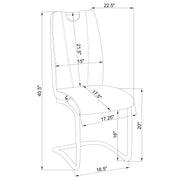 Give your entertainment area an ultra-modern feel with this five-piece dining table set. A spacious rectangular table with a gleaming high gloss white finish is supported by three stainless steel supports in a lustrous chrome finish that rest on a flush base that mirrors the top. With a pedestal-like design, the dining table invites each of the four cantilever style dining chairs to slide up for meals and conversations. Sit back and rest in the upholstered seats, wrapped in a two-tone gray and white leatherette that accents the contoured shapes. Mounted on a polished chrome metal base, the cantilever design chairs also offer an open, airy feel that showcases the table.