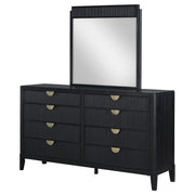 Dress up your bedroom with the impeccable texture and styling of a modern eight-drawer dresser and mirror. Vertical fluting decorates each drawer front and crowns the mirror, offering a refined, artistic touch that elevates without overwhelming. A black finish is rich and deep, perfect to blend with a variety of existing decor and furniture pieces. Its drawer fronts feature vertical fluting details and half-moon handles in a golden finish, delivering the perfect blend of contrast and texture. A framed mirror on top completes the look and offers reflectivity and depth in your bedroom. Key Features: • Chic fluting adds depth and dimension to a modern eight-drawer dresser and mirror • Includes eight drawers of various sizes to accommodate all your clothing and accessory storage needs • Black finish is rich and deep, complementing in many different bedrooms and dressing areas • Half-moon drawer handles are warm and inviting, with a gold finish that adds contrast and dimension • Top drawers include felt lining that offers protection to delicate items, jewelry and accessories • The beveled mirror creates an illusion of depth and dimensionality