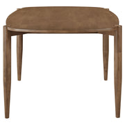 Indulge in a love of Euro-inspired fare that suits your discerning interior design requirements. This modern five-piece dining set is suited to both contemporary and transitional spaces, bridging motifs creating carefree aesthetics. Walnut finish Asian hardwood construction is sturdy without overly chunky, maintaining the clean lines you like to see. This set features a rectangular table with a straight edge top and rounded corners, as tapered legs are flush mounted as exterior side accents. Retro influence creates four chairs with curved backrests and nicely padded seat cushions upholstered with soft brown fabric.