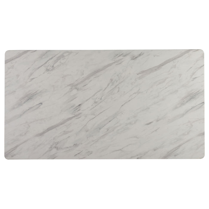 A festive mix of Euro style and Mid-Century Modern Americana merge to create a pleasing look that upgrades your casual dining space. With a faux marble rectangular tabletop, its glam factor raises a bit and draws attention. Tapered, rounded legs made of natural walnut finish wood coordinate with charmingly angled chair frames that include a sleek rounded back. Upholstered seat cushions bring a soft look to this set. Includes a dining table and six armless side chairs.