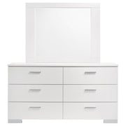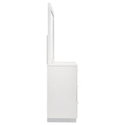 This dresser and mirror set brings streamlined function to contemporary bedrooms. The six-drawer dresser offers ample storage with smooth metal extension glides, while the mirror features a white high gloss frame that reflects light and complements the dresser’s modern silhouette. Chrome-finished handles and feet enhance the look with refined detail, making this set a practical yet stylish addition to your space.