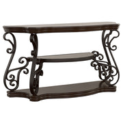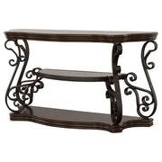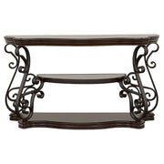 This elegant console table, also known as a sofa table, seamlessly combines style and function. Its dark merlot wood finish highlights the engineered wood and cherry veneer construction, while the ornate scrollwork on the dark bronze powder-coated metal legs enhances its timeless charm. The polished wooden middle and bottom shelves offer additional storage or display space. Perfect for accentuating hallways, living rooms, or behind sofas with classic sophistication. Key Features: • Console table with dark merlot wood finish for a rich and elegant look • Dark bronze powder-coated metal legs with intricate scrollwork design • Engineered wood and cherry veneer ensure a durable and refined construction • Polished wooden middle and bottom shelves offer storage or display options • Blends traditional craftsmanship with practical functionality • Versatile piece ideal for hallways, living rooms, or behind sofas