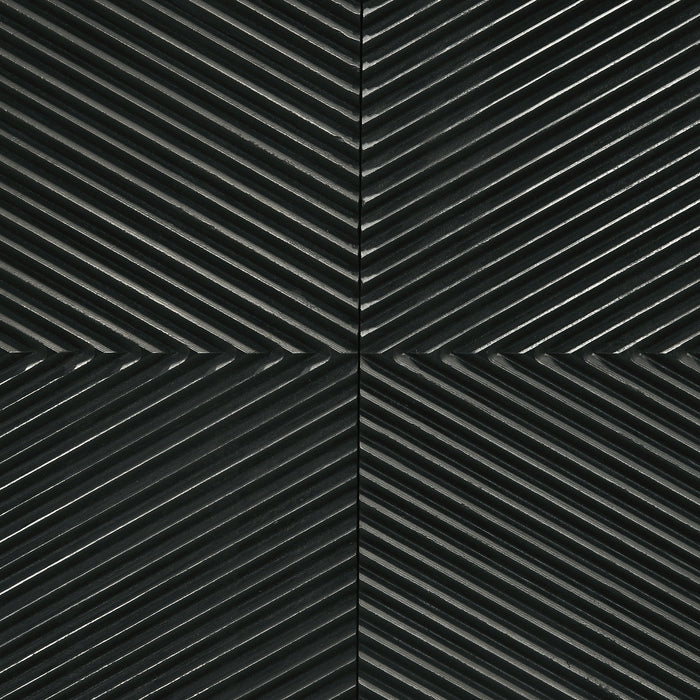Bold finish composite wood and iron merge to create a stylish and durable four-door accent cabinet. Perfect for use in your dining room, living room, or media room, this chic cabinet is versatile and attractive. Diagonal self-striping adds textured effects on its door fronts to create a compelling look. Find space on two adjustable shelves behind four doors that open with matching black iron vertical pulls. Set atop a geometric black finish iron frame, this cabinet serves as a striking example of bold style.