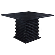 Express modern simplicity with the neutral tones from this five-piece dining set. Constructed of ash veneers, the table and four side chairs feature a rich black finish. Sleek and clean, the open base of the chairs are complete with built-in foot rests and a softly upholstered seat and back. Go all-in on a contemporary casual dining room theme, or add a sophisticated feel to a laid-back entertainment room. The geometric base is elevated with a subtle wave design to enhance visual intrigue.