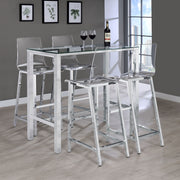 Shift to a futuristic design motif as you entertain in style. An unconventional mix of materials form elegance with simplicity in a five-piece bar set perfect for hosting your happy hours and casual lunches. A rectangular table features a clear glass top over linear metal framing, sparkling and energetic in appearance. Shapely clear acrylic seats perch over metal frames with built-in footrests. Explore a new approach to contemporary living with this chic set. Key Features: • Entertain in style with a futuristic design motif • Unconventional mix of materials form elegance with simplicity in a five-piece bar set • Rectangular table features a clear glass top over linear metal framing • Shapely clear acrylic seats perch over metal frames with built-in footrests • Explore a new approach to contemporary living with this chic set
