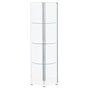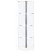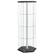 This curio cabinet reimagines display storage with a striking hexagonal silhouette. Its geometric shape adds visual depth while clear tempered glass panels showcase treasured items from all angles. Three round glass shelves offer generous space for décor, collectibles, or keepsakes, supported by a sleek center pole with chrome accents. With a magnetic push-to-open door and sturdy construction of glass, engineered wood, and laminate veneer, this piece is a stylish way to highlight what matters most. Key Features: • Hexagonal curio cabinet in black with sleek chrome accents and center pole • Magnetic push-to-open clear tempered glass door provides easy access • Three round tempered glass shelves for collectibles and decorative items • Clear tempered glass panels highlight displays from multiple viewpoints • Constructed with glass, engineered wood, laminate veneer, and metal • Geometric design creates a striking modern presentation for display pieces